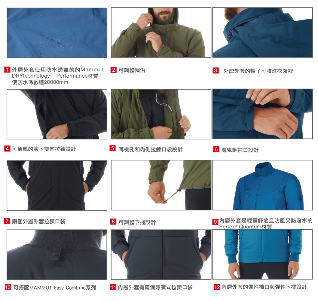 可拆式的保暖化纖內層,及Mammut 獨家DRYtechnology防風防水技術,