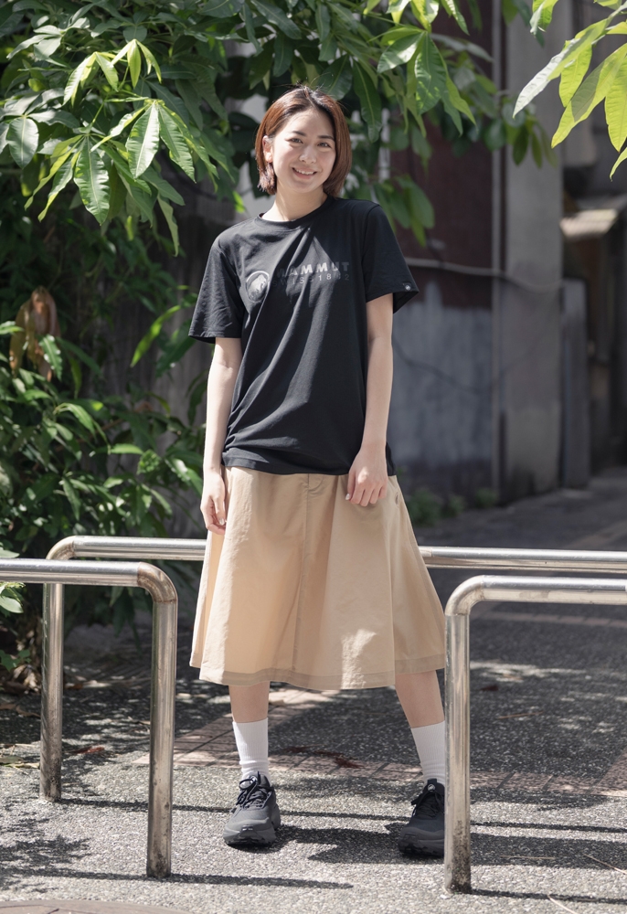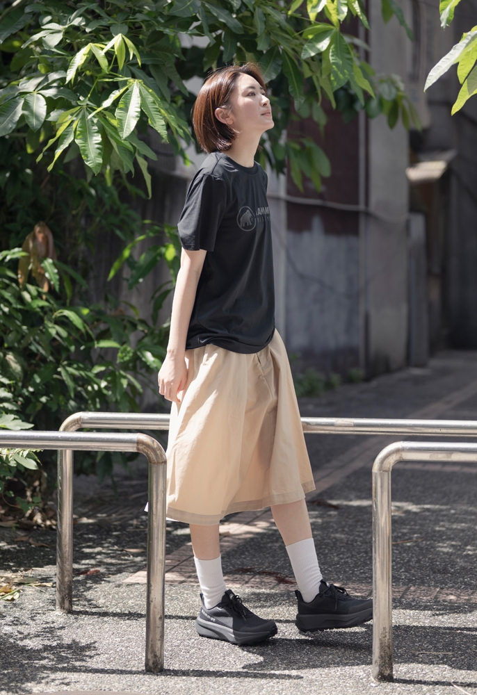 下身穿著 Highland Traveler Skirt AF(薩凡納褐 女款),選用高耐磨尼龍機能布料,具備 UPF 50+ 防曬功能與 PFC-Free 防潑水處理,膝下長度搭配 A 字剪裁,行走時自然飄逸;內建可調式腰帶與兩側口袋,兼顧舒適與收納機能。