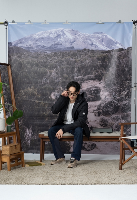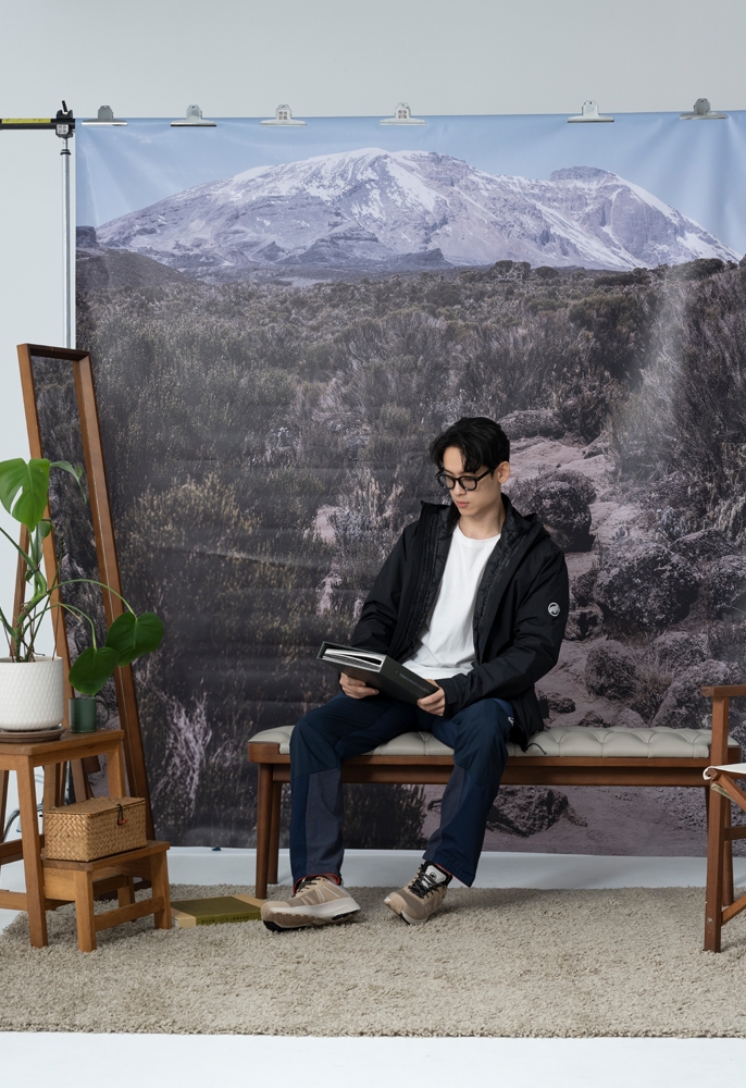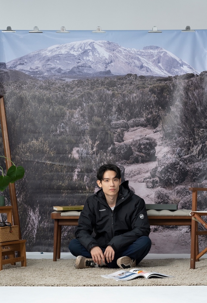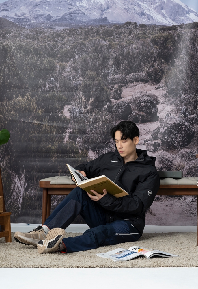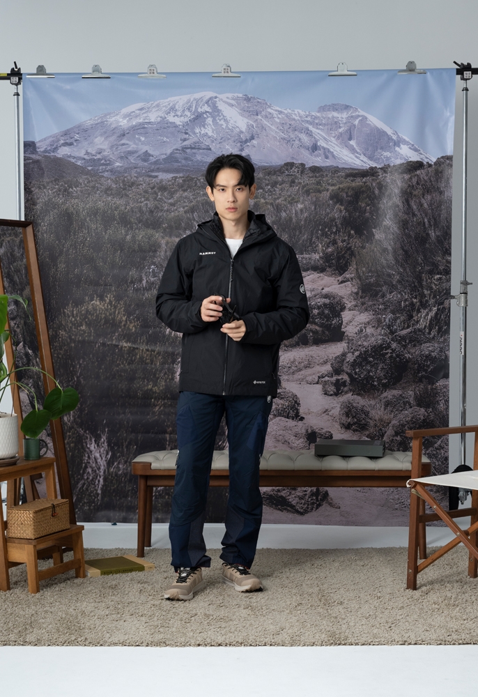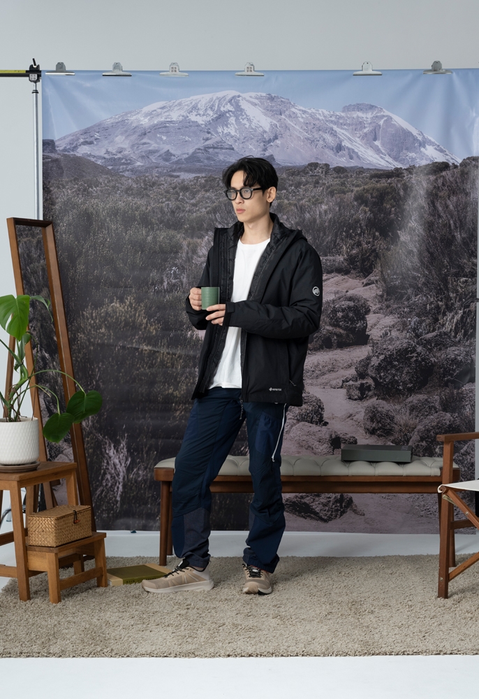 腳上搭配 Saentis TR Low GTX,褐白配色呼應大地色調,為黑藍主調增添溫度。GORE-TEX 加持不怕雨天,Vibram 黃金大底走在濕滑路面也穩當。低筒版型俐落好搭,不只爬山能穿,日常通勤也完全不違和。