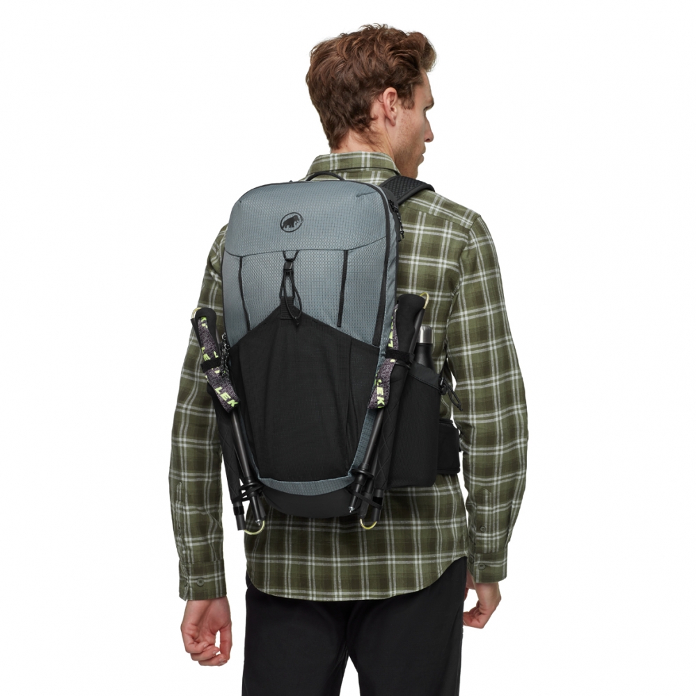 - 登山杖固定系統(可固定於前方與側邊,適用 Z 型登山杖)